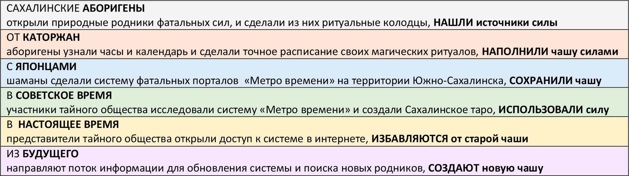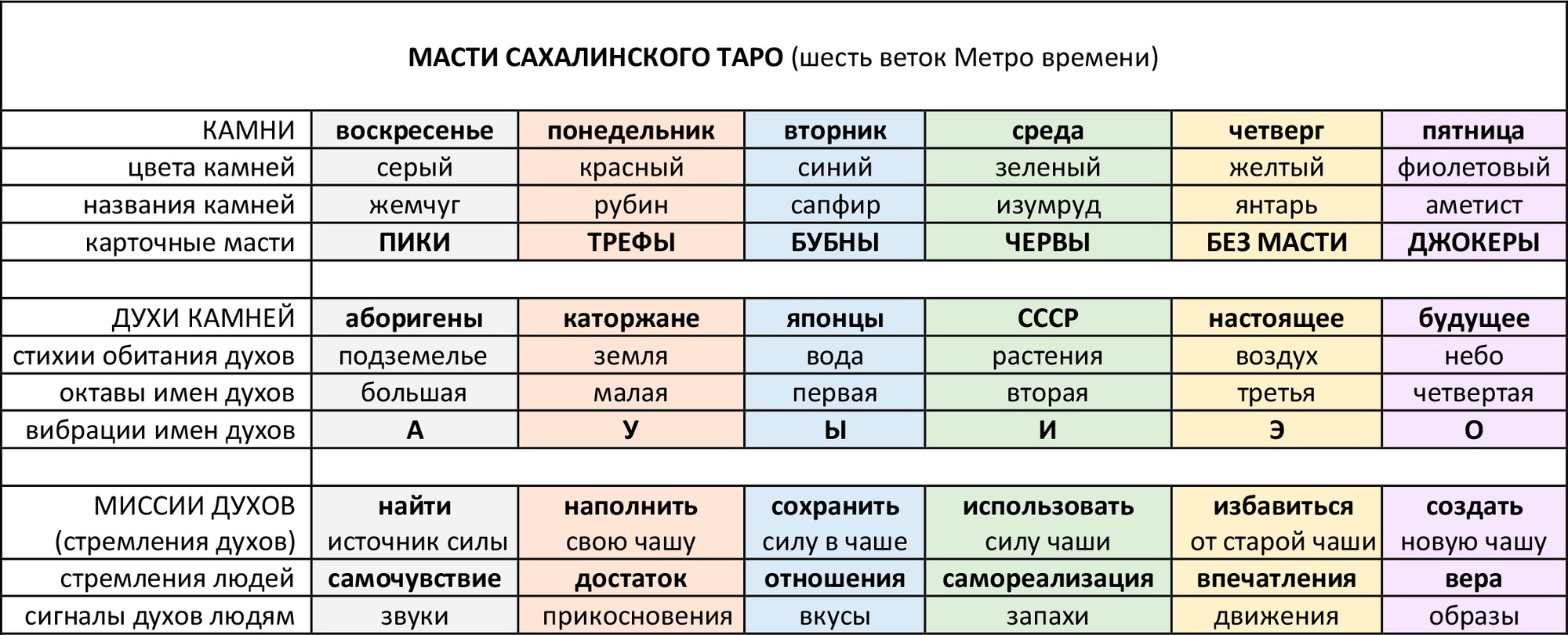 В колоде шесть мастей - шесть цветов судьбы, шесть дней творения, шесть стихий обитания духов судьбы, их миссии и вибрации, шесть человеческих стремлений и чувств. В метро времени шесть веток, и каждая работает в свой день недели.