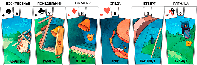 Шесть карт с мастями, но без номиналов и персонажей, обозначают время 00:00 (смена дня недели и масти).