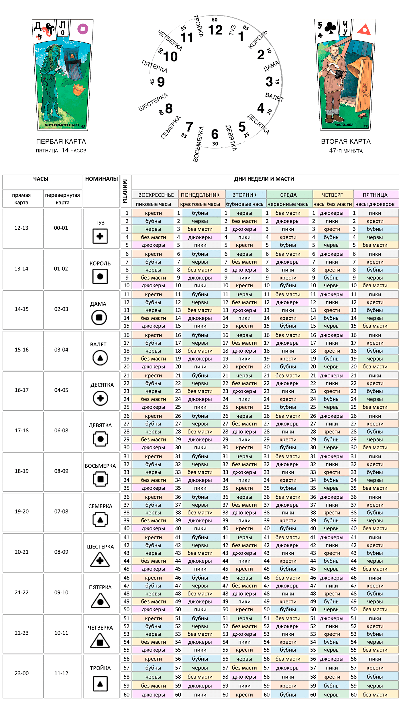 ПЕРВАЯ КАРТА (слева) определяется по календарю и часовой стрелке часов: день недели показывает масть, а текущий час показывает номинал. Карта перевернута с 00 до 12.