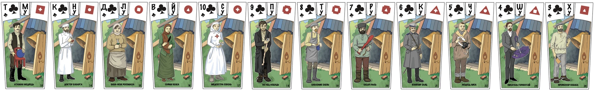 Шесть карт с мастями, но без номиналов и персонажей, обозначают время 00:00 (смена дня недели и масти).